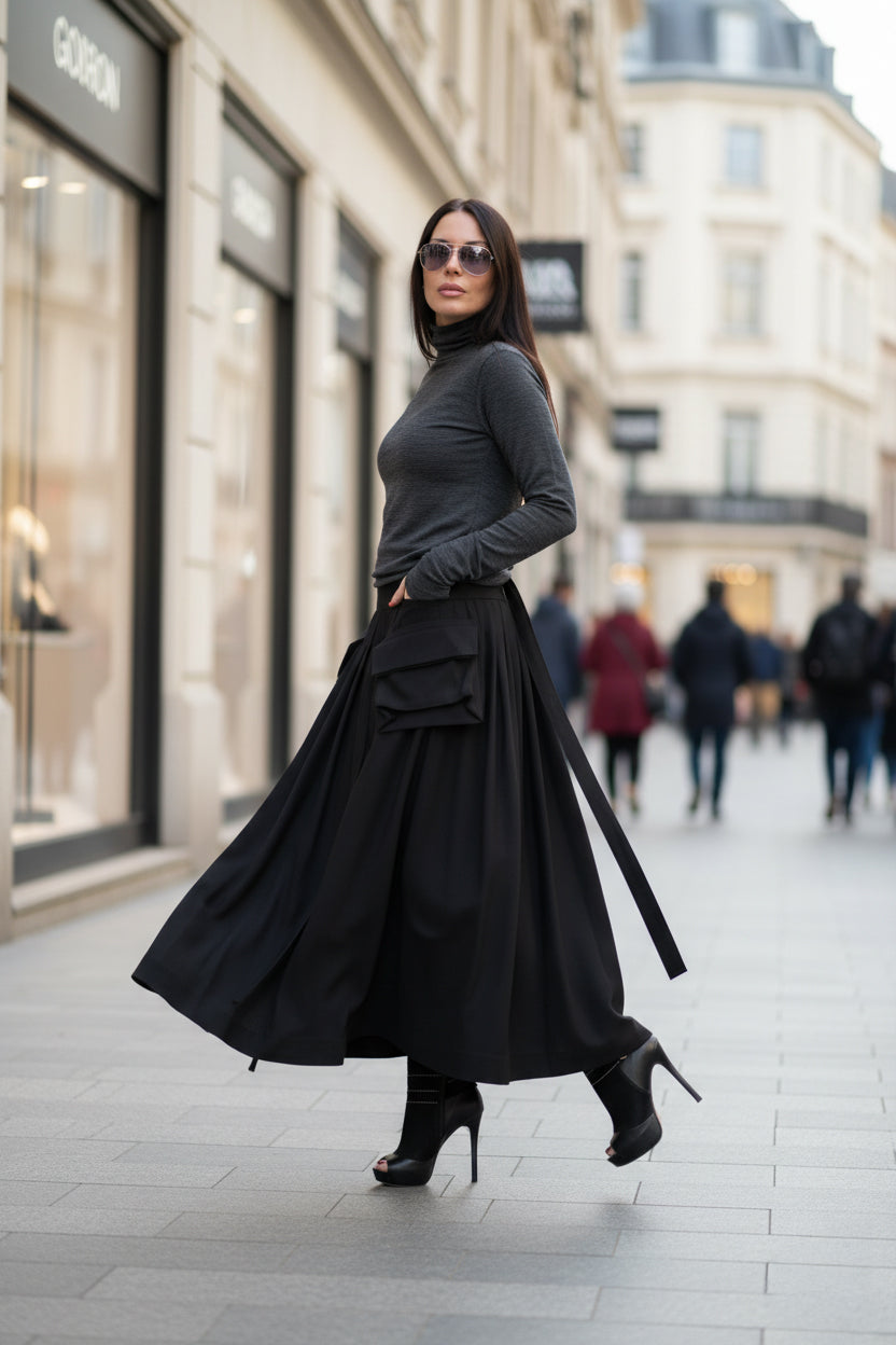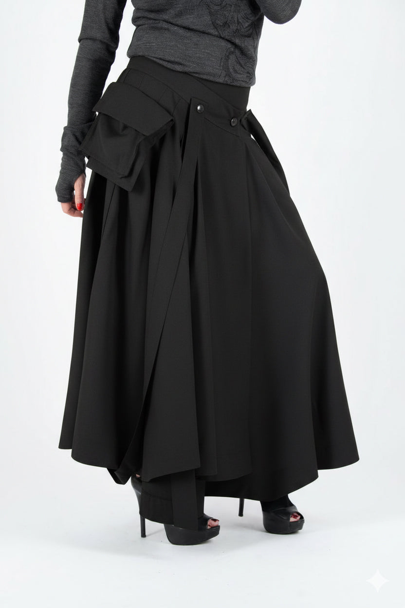 Прегърнете модерната изтънченост с нашата черна асиметрична карго пола , перфектно съчетание на стил и функционалност. Тази широка А-силует пола се откроява със своя асиметричен силует, карго джобове и тиранти, предлагайки съвременен и универсален вид. Обгръщащият дизайн, закопчаване с копчета и стилна цепка, добавя изтънчен щрих, което я прави идеална за всеки повод или сезон.