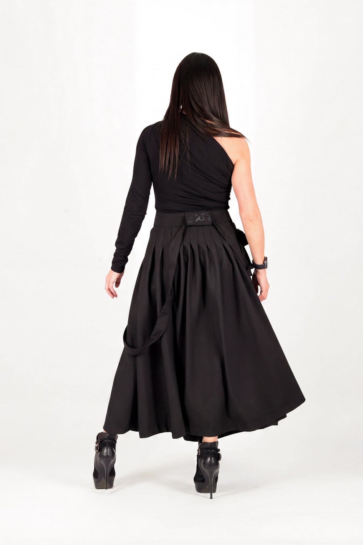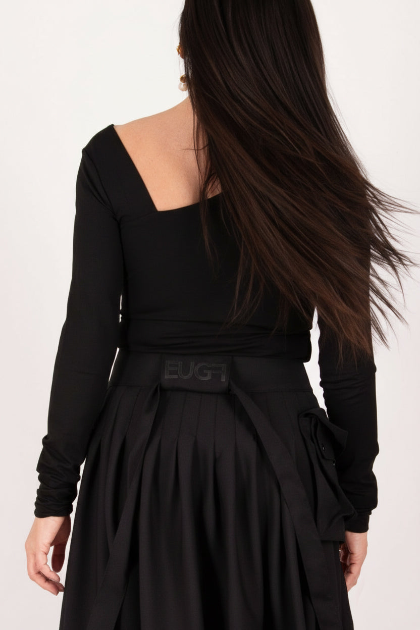 Black skirt worn by a person on a white background EugFashion