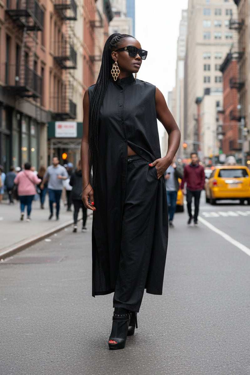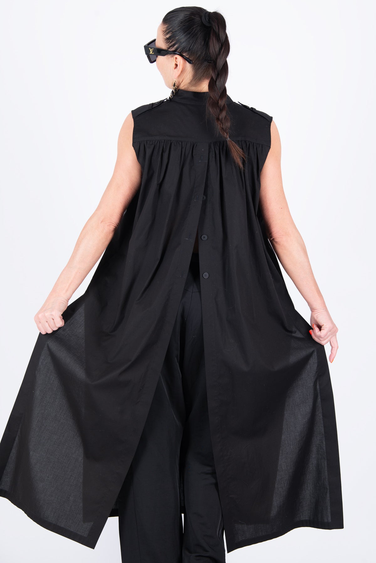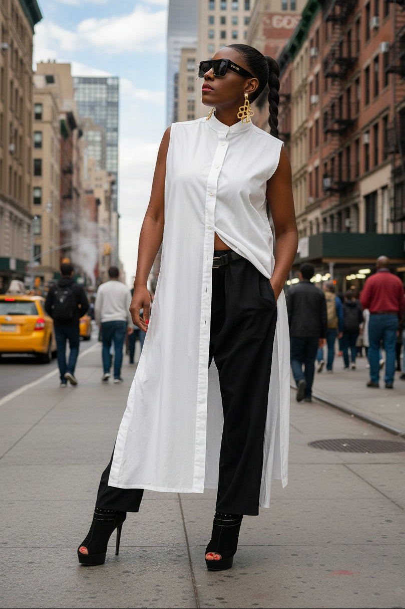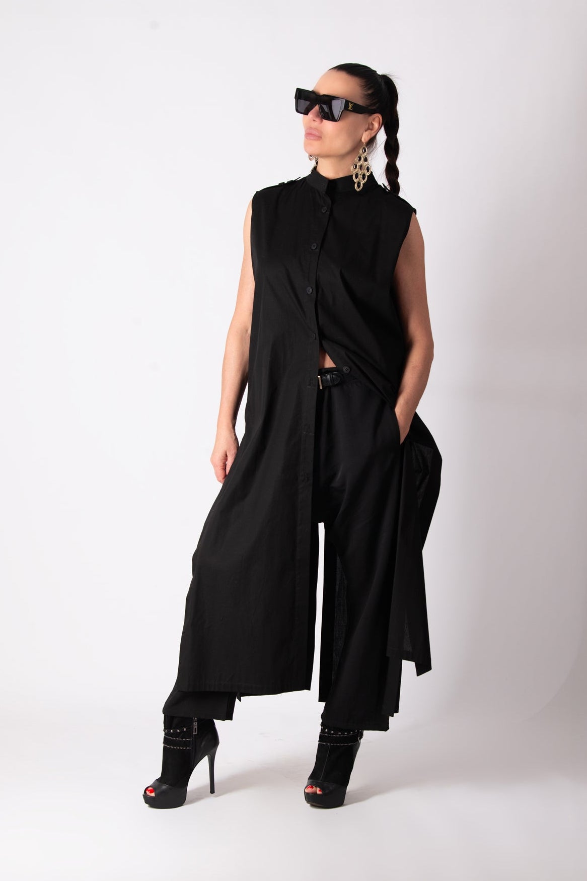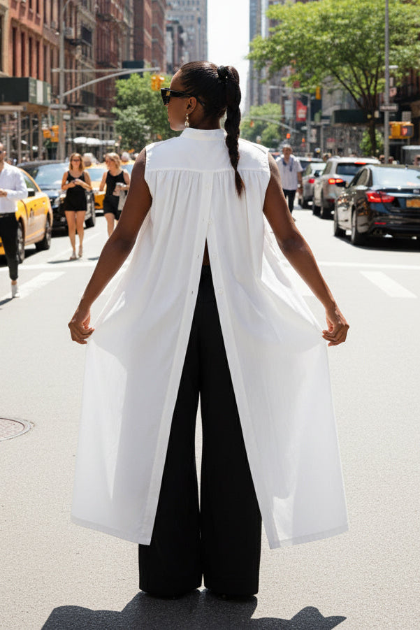 Подобрете летния си гардероб с тази дълга памучна риза без ръкави в черно или бяло , създадена за непринуден стил и комфорт. С лек А-силует , тази риза се спуска красиво за непринуден, но изискан вид. Закопчаването отпред с копчета добавя класически щрих, докато дизайнът без ръкави я прави ефирна и идеална за топлите дни. Изработена от лек памук , тя е идеален избор за летен стил. Комбинирайте я лесно с клинове, дънки или шарамени панталони , точно както на снимката, за модерен и изискан тоалет.