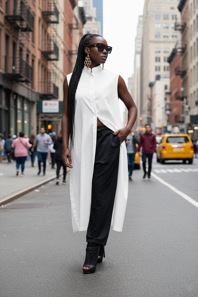 Person wearing a white sleeveless top and black pants on a city street. EugFashion