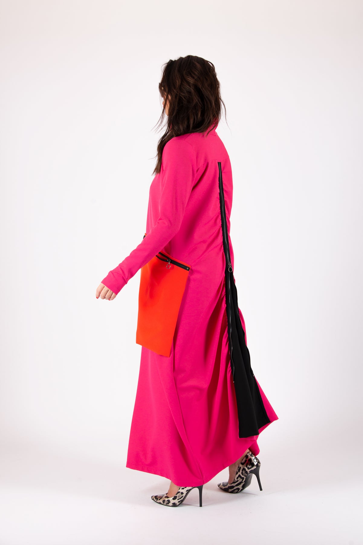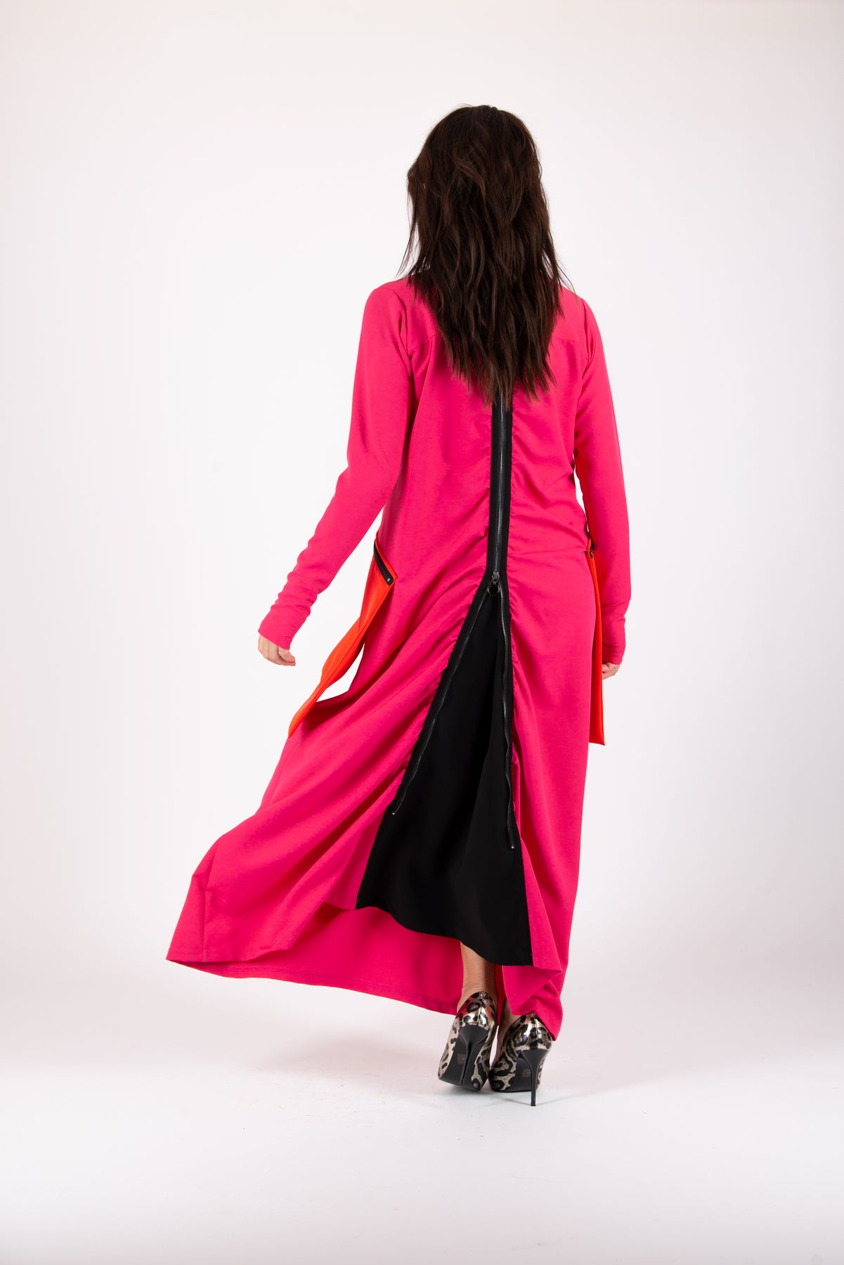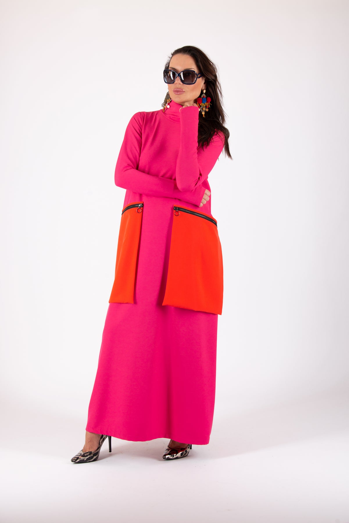 Woman wearing a bright pink dress with orange accents on a white background EugFashion