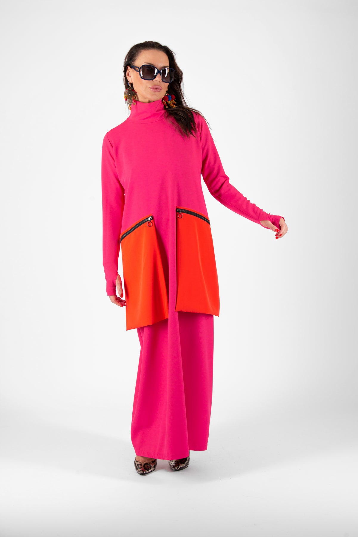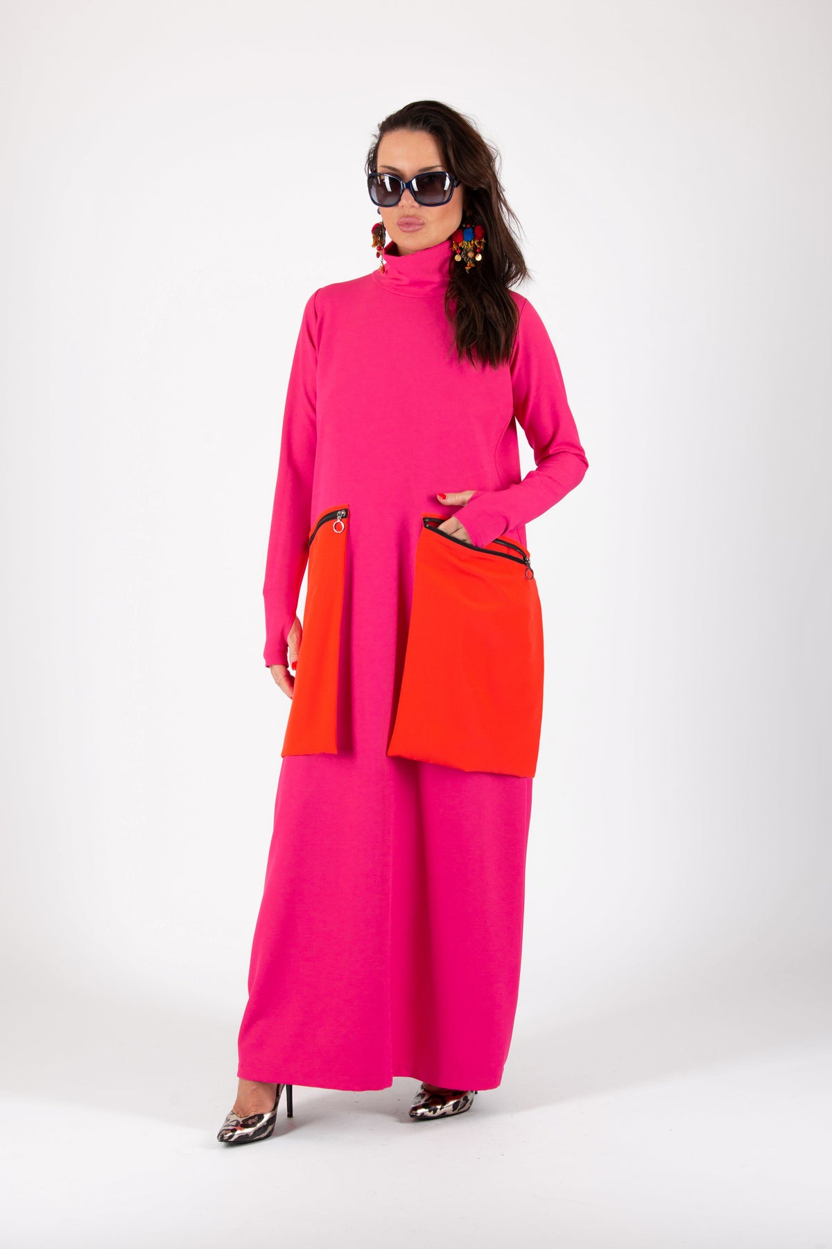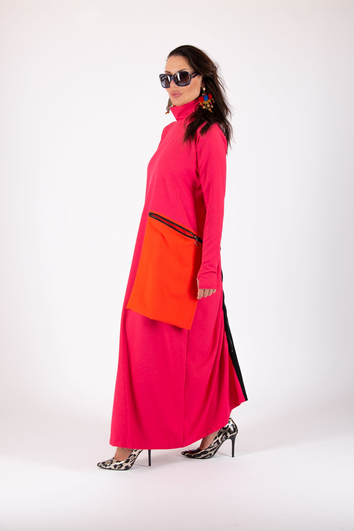 Woman wearing a bright pink dress with orange accents on a white background EugFashion