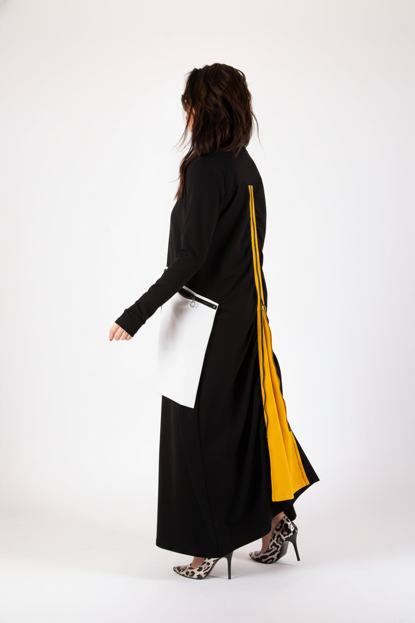 Woman wearing a black and yellow dress on a white background EugFashion