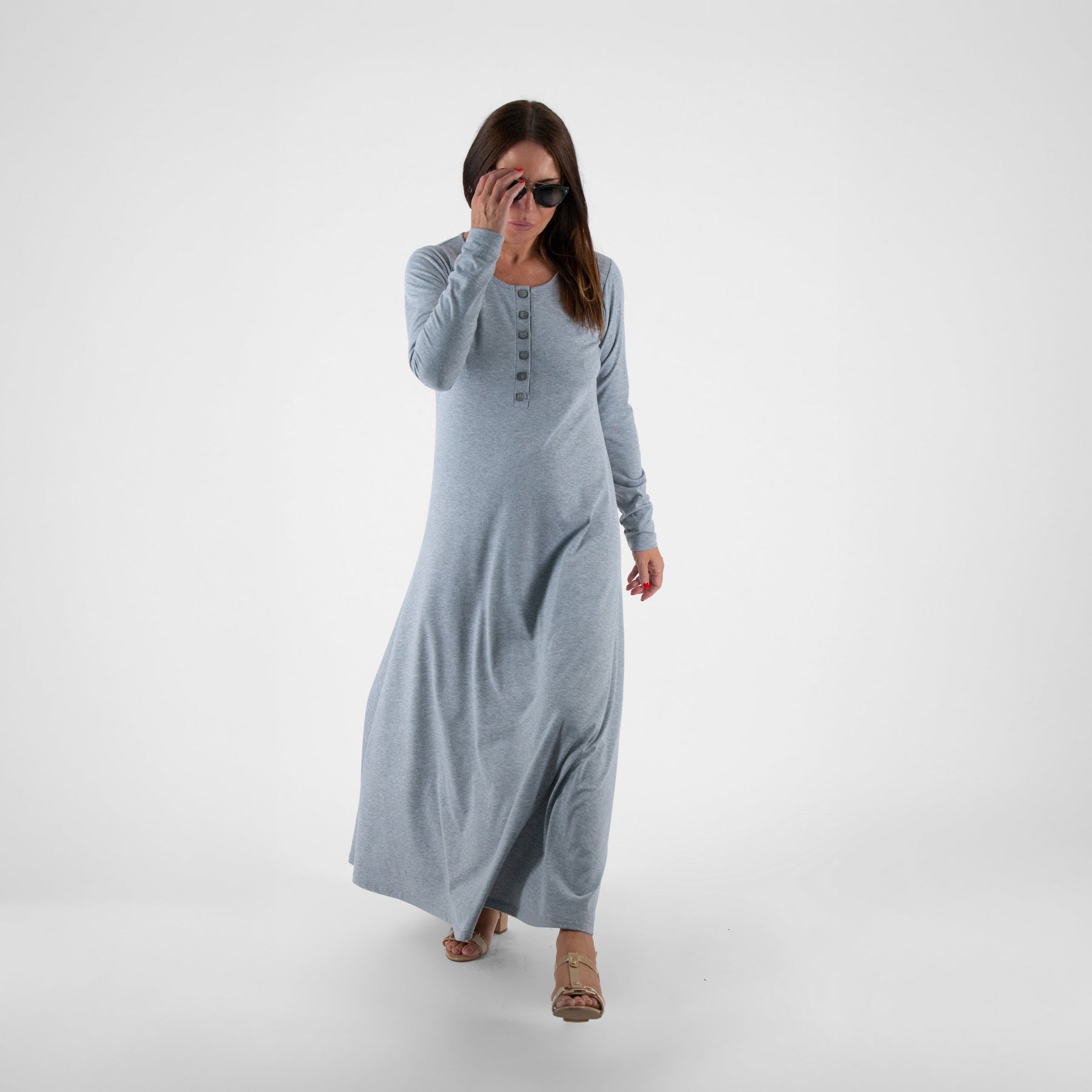 Woman wearing a long gray dress on a white background EugFashion
