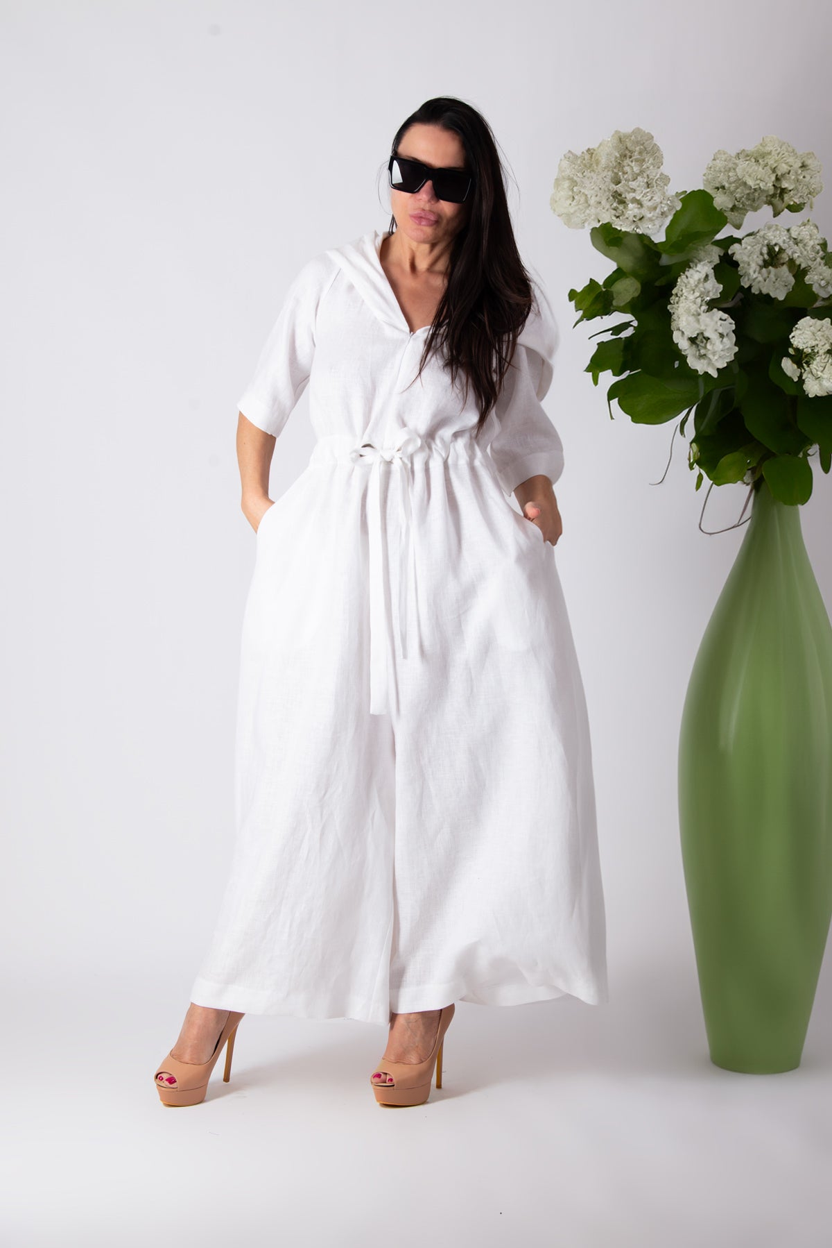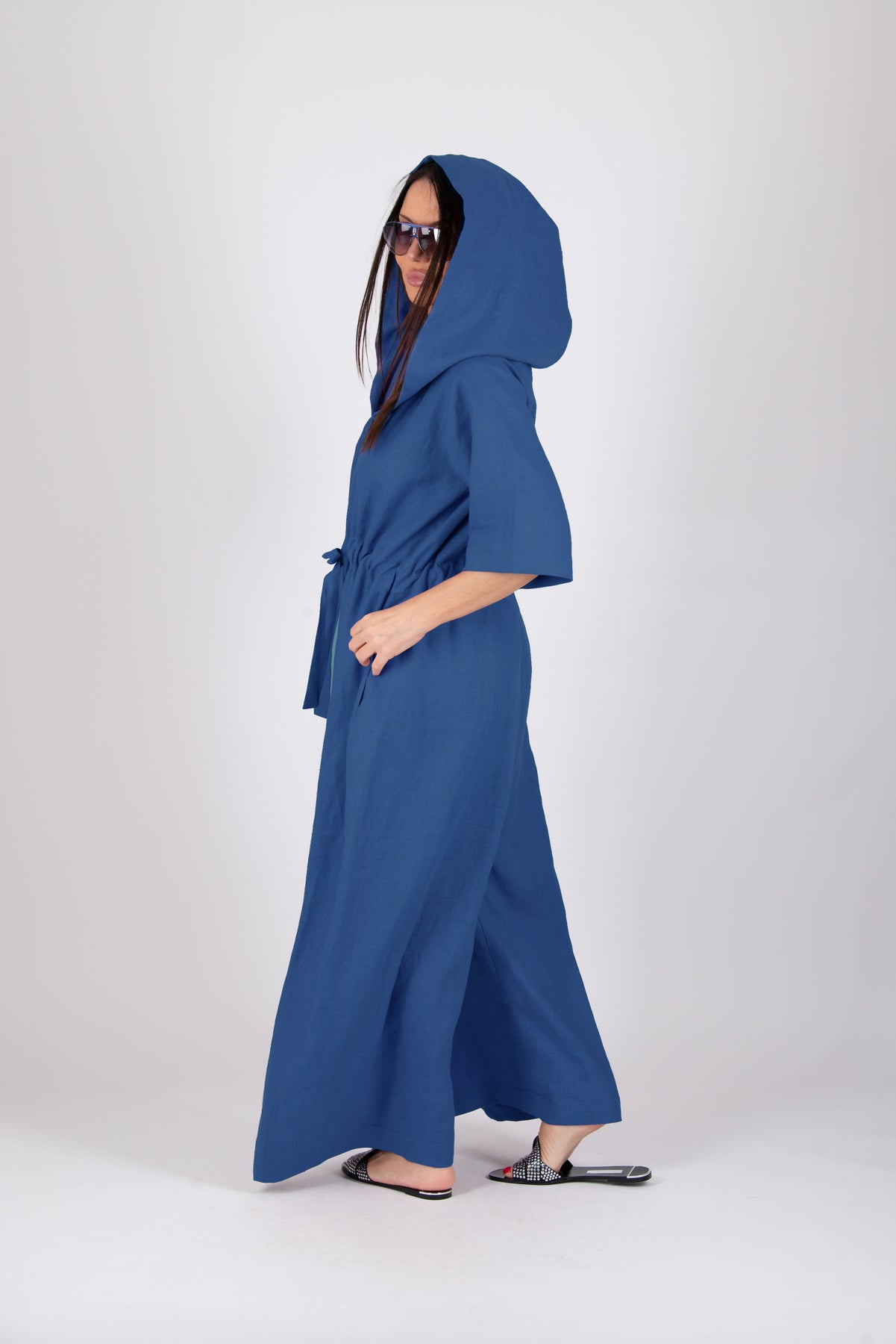 Crafted from breathable lightweight linen, it features a relaxed silhouette with wide short sleeves and fluid wide-leg pants that create natural movement and a soft, sculptural drape. The adjustable waist drawstring allows you to shape the fit to your preference, while the hood adds a subtle contemporary edge.