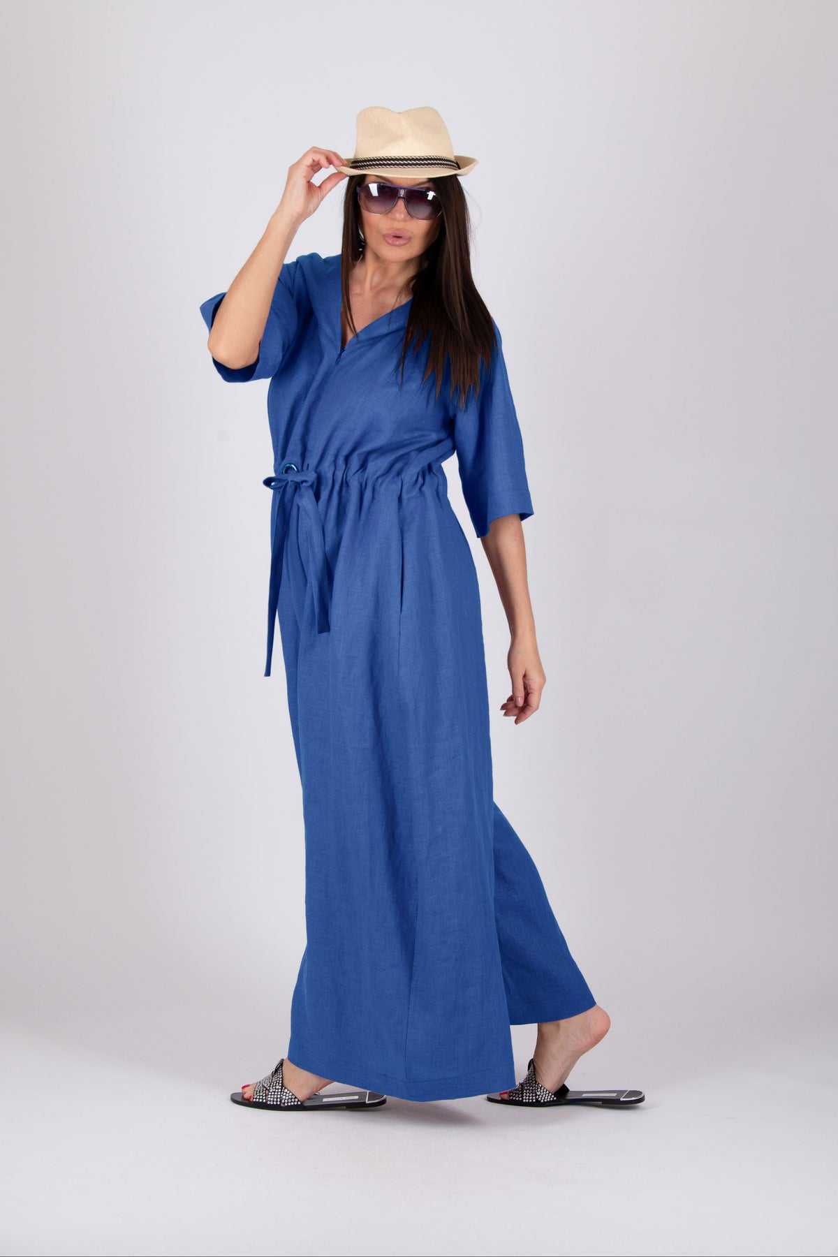 Woman wearing a blue dress and beige hat on a white background EugFashion