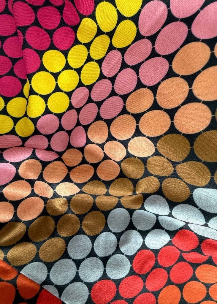Woman wearing a colorful patterned outfit on a white background EugFashion