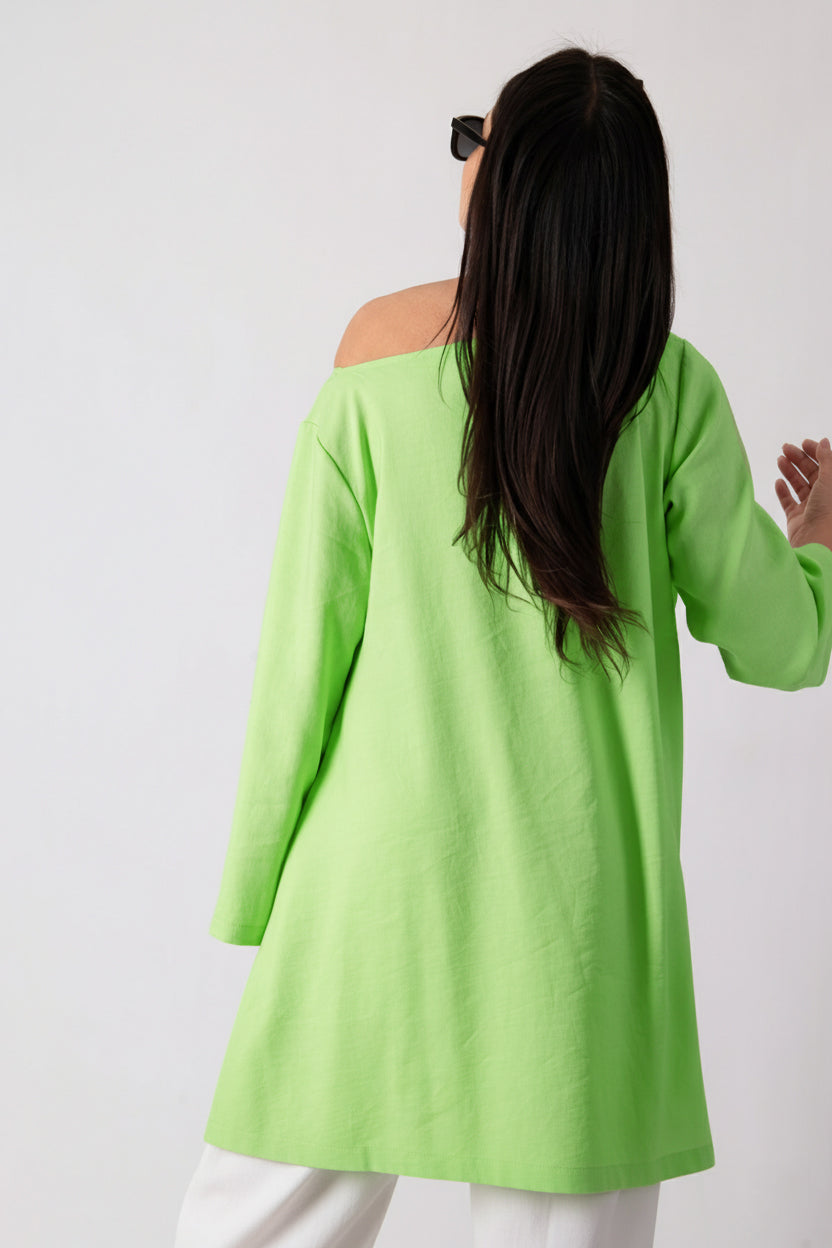 Person wearing a bright green off-shoulder top against a white background EugFashion