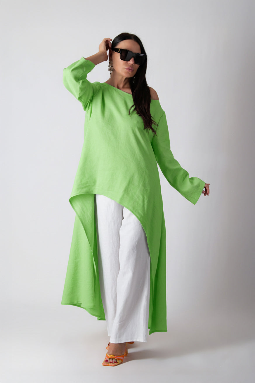 Enhance your summer wardrobe with our Wide Linen Top, a blend of elegance and comfort designed for warm-weather styling. Featuring a unique asymmetric silhouette and crafted from breathable 100% linen, this top is a perfect addition to your collection.