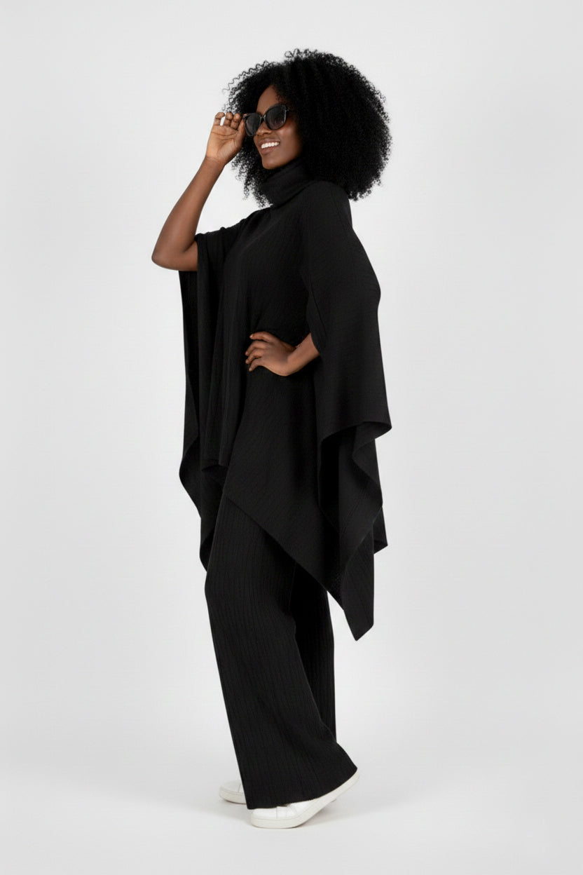 This cozy two-piece set includes a soft turtleneck poncho and long trousers with an elastic waistband, offering maximum comfort and ease of movement. Crafted from very soft and warm knit fabric, it feels gentle on the skin and is perfect for colder days.