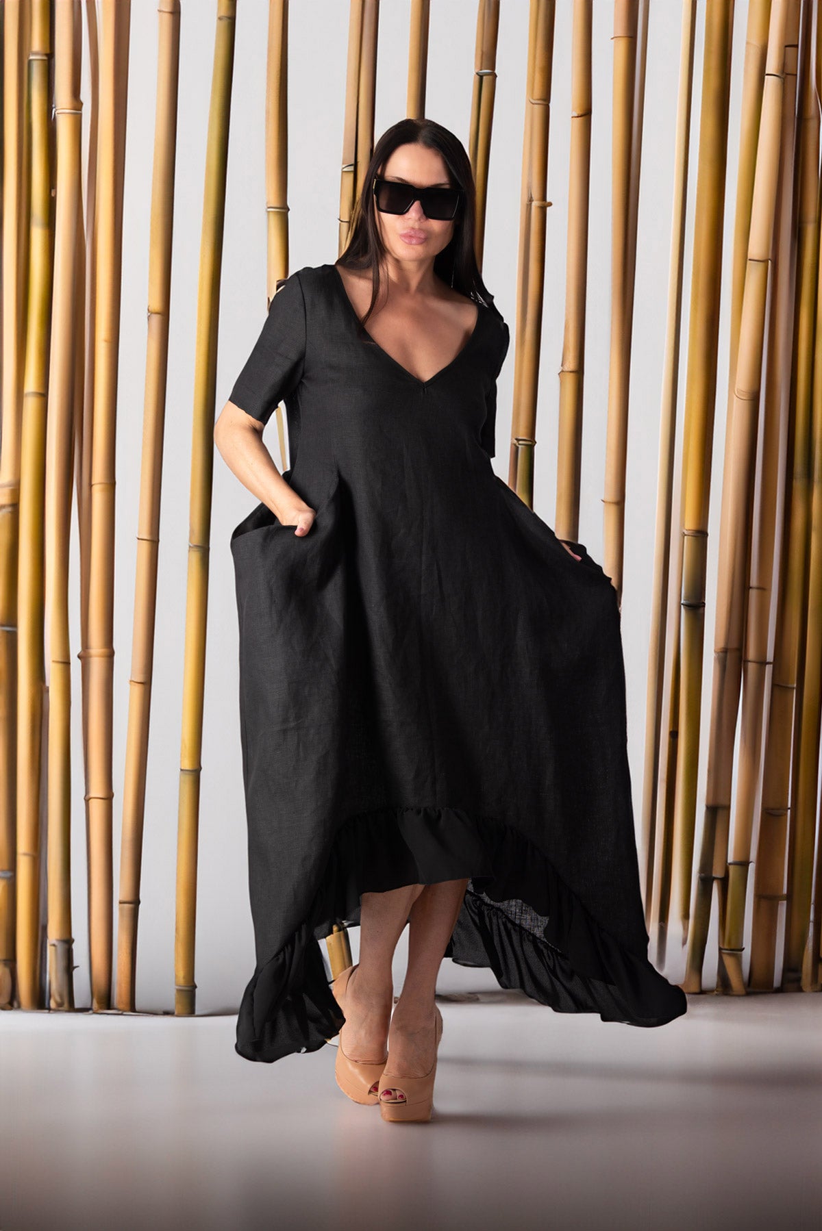 • Elegant Design: Ethereal black linen dress with a chiffon ruffle hem for a unique, graceful touch.