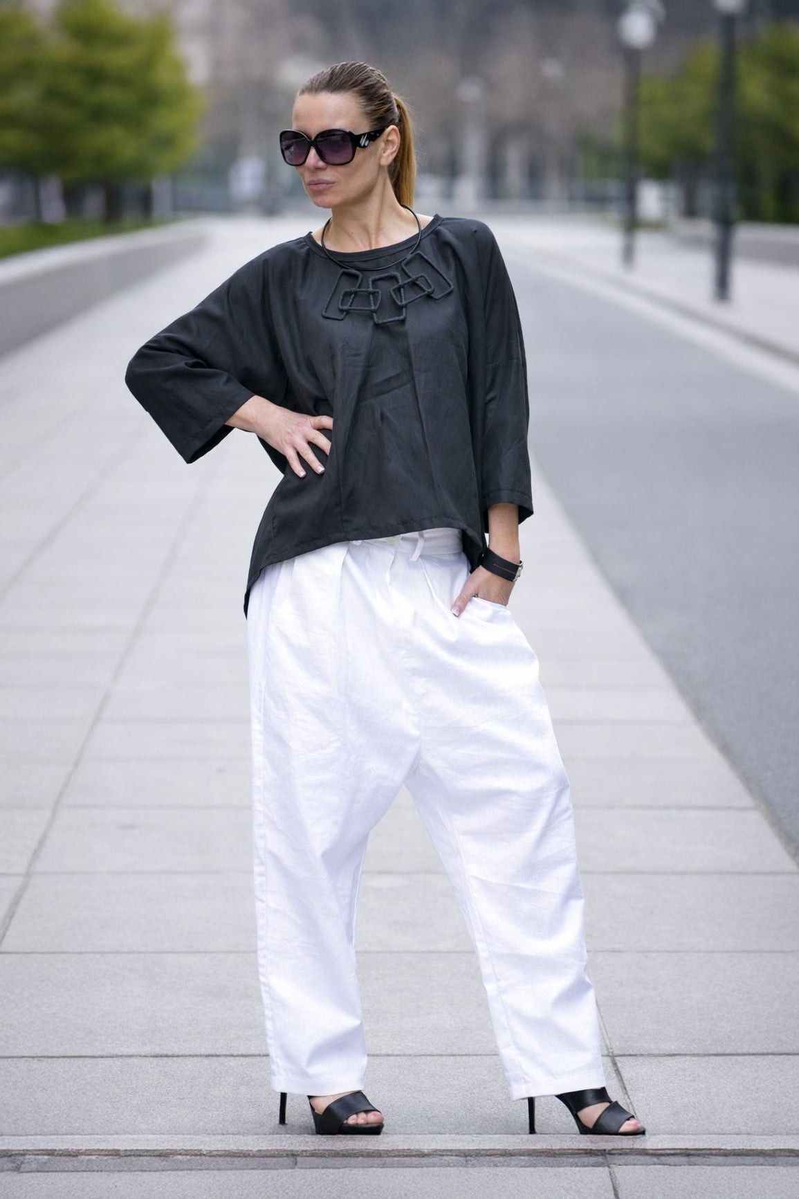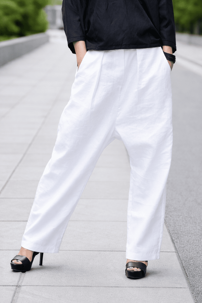 Available in classic black and white, making these pants easy to pair with tunics, linen tops, or structured blouses.