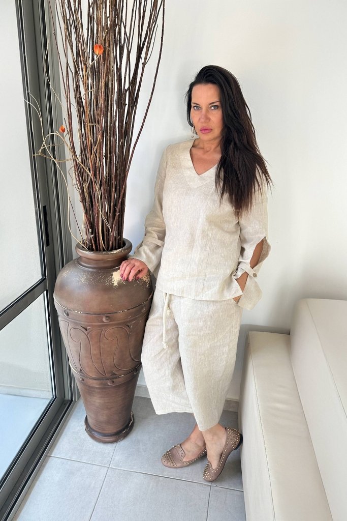Style it with linen pants, wide-leg trousers, or skirts for a versatile, elegant look that feels as good as it looks.