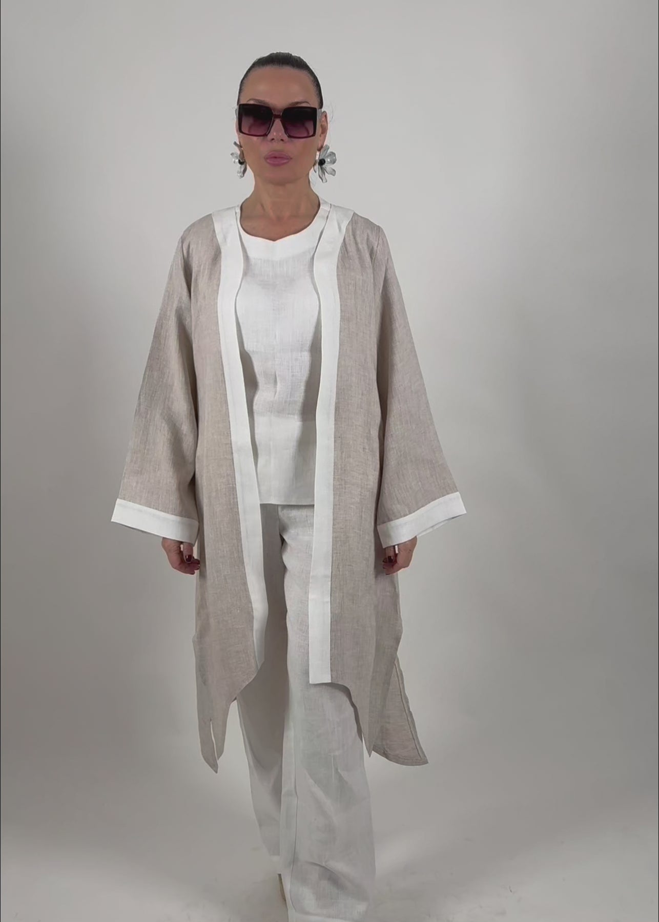 Elevate your summer layering with this stunning two-tone linen duster cardigan. Crafted from 100% natural linen, it features a soft beige body with contrasting white trim for a clean, effortless look. The open-front design, wide sleeves, and asymmetrical hem give it a relaxed yet sophisticated silhouette that moves beautifully.