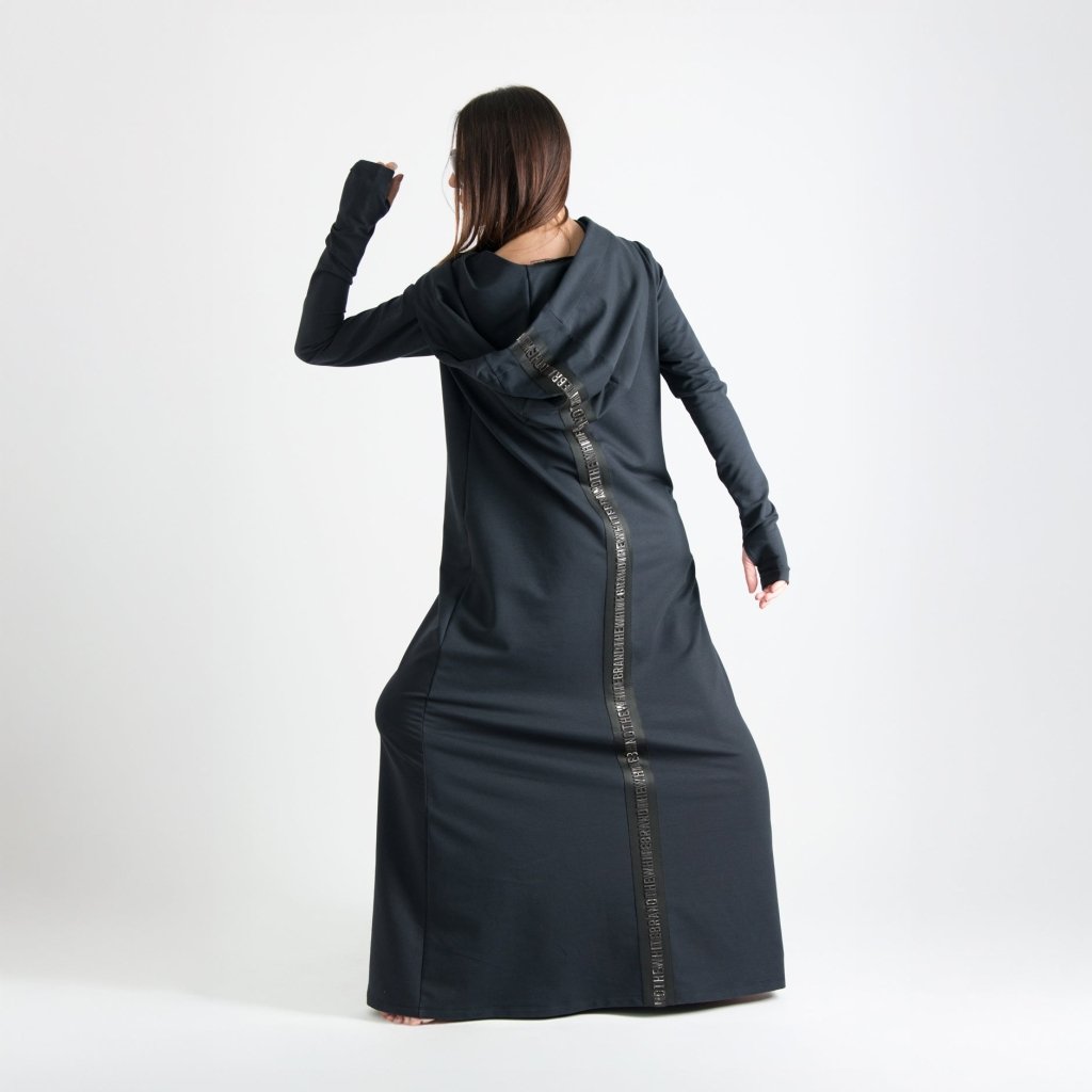 Black Maxi Hooded Dress with Shiny Black Stripe