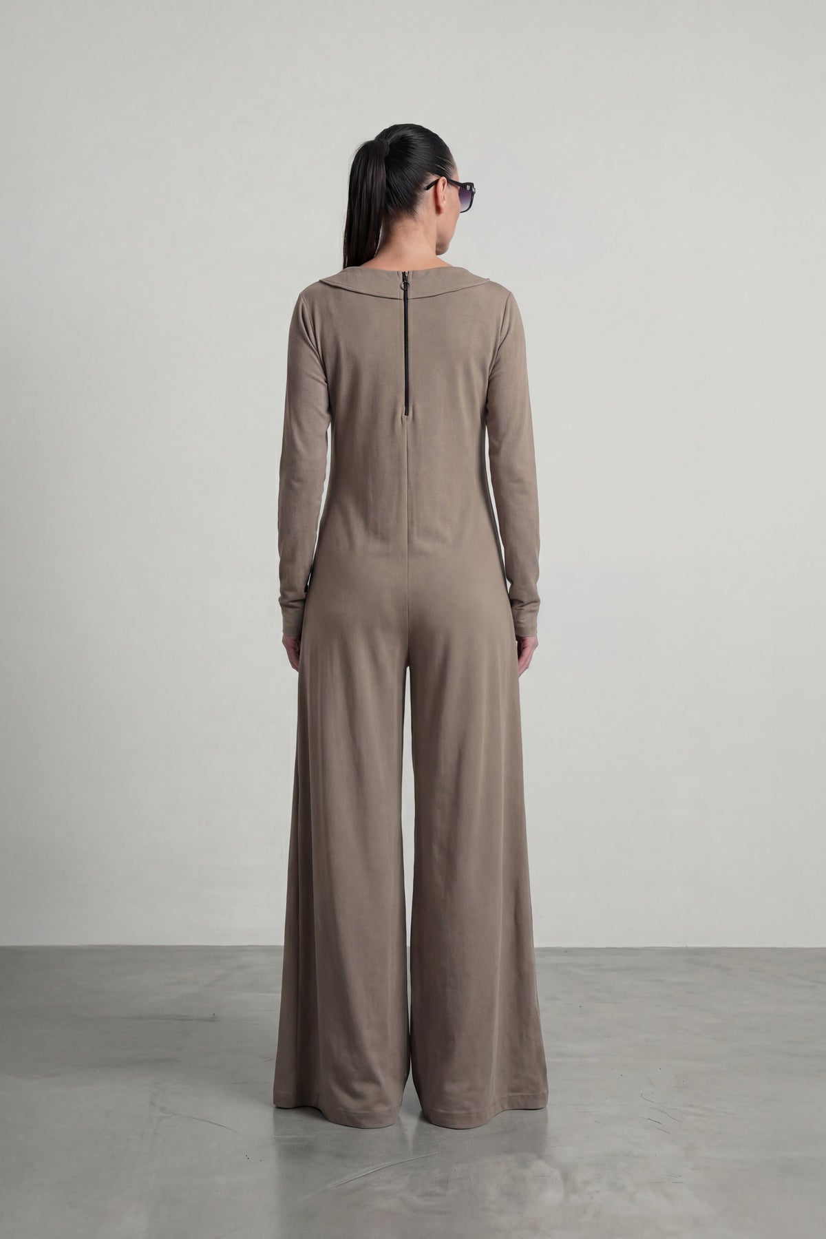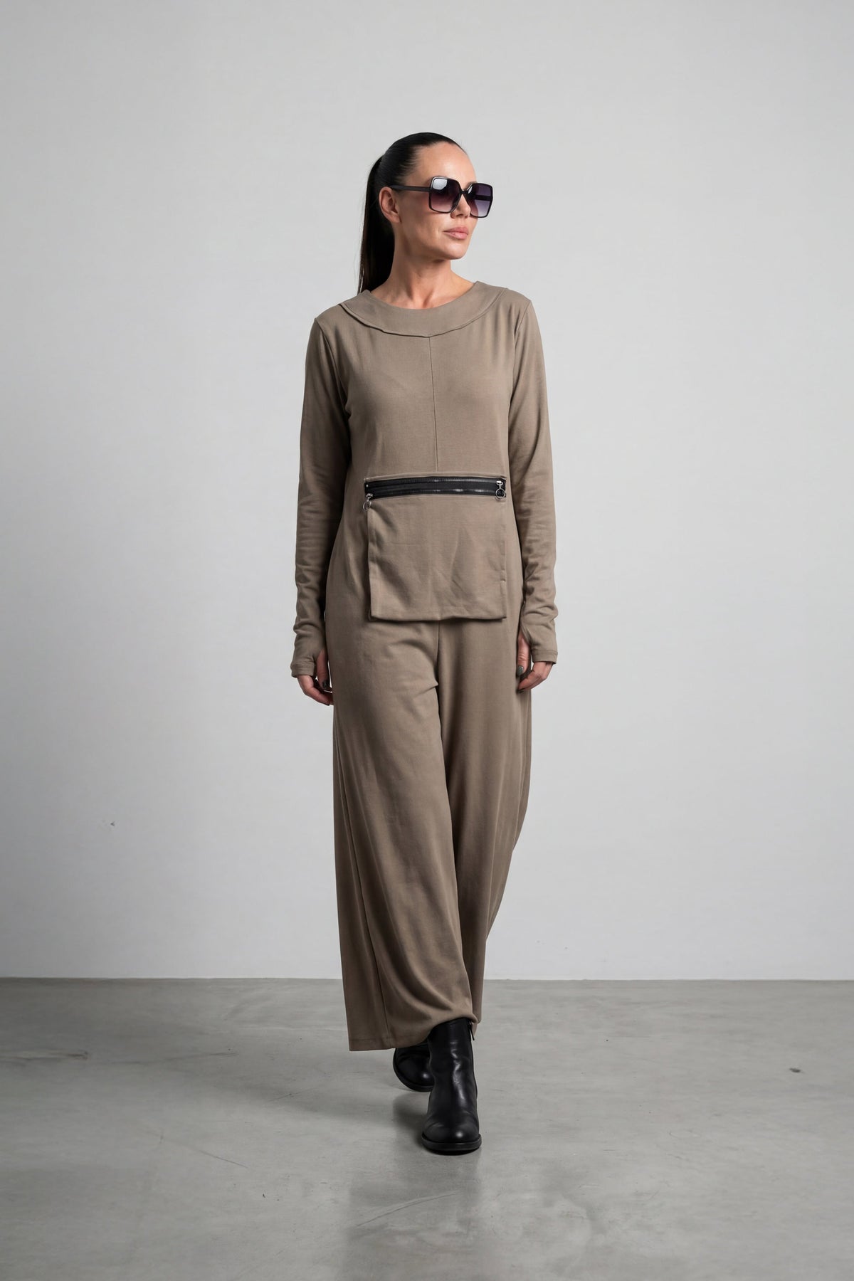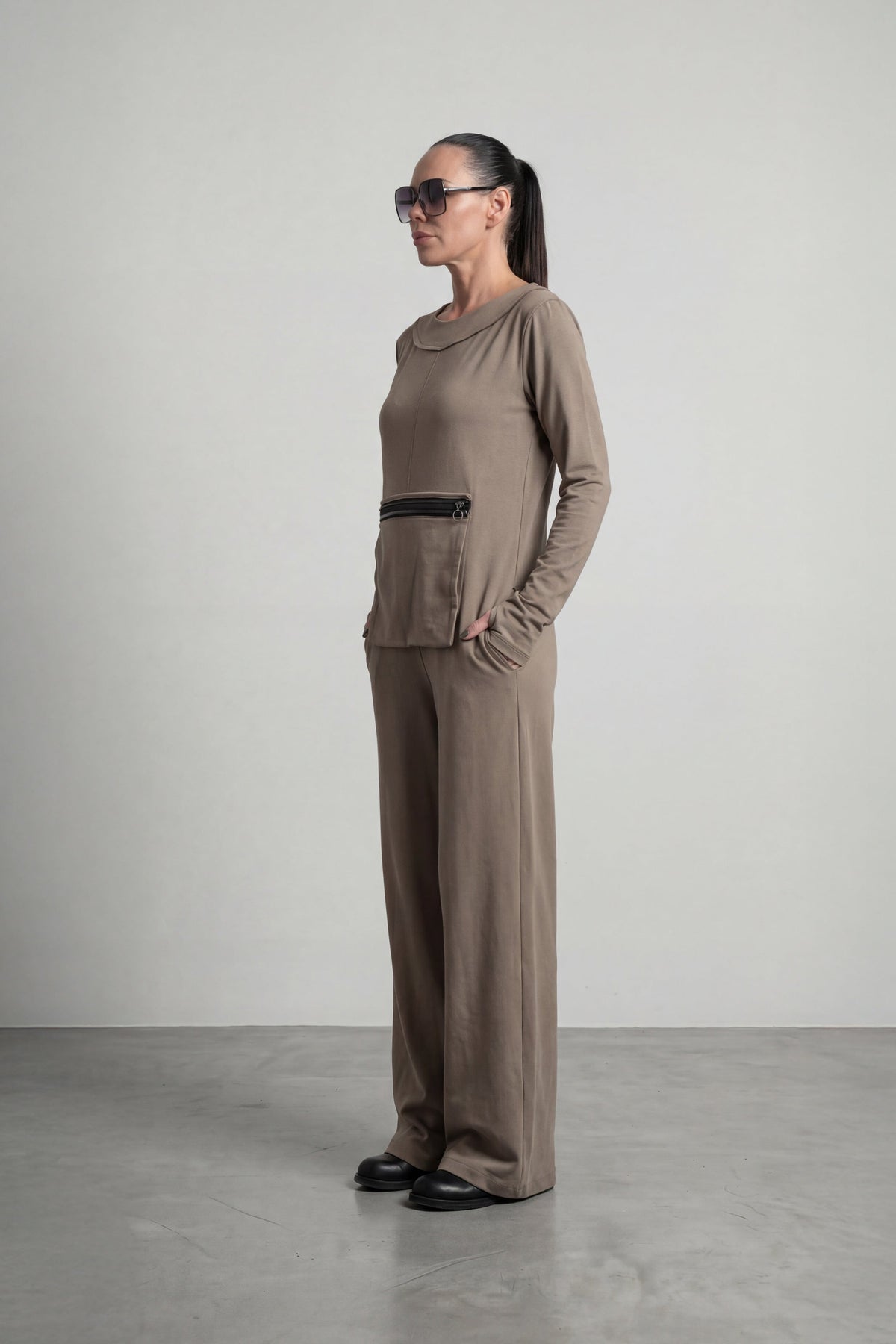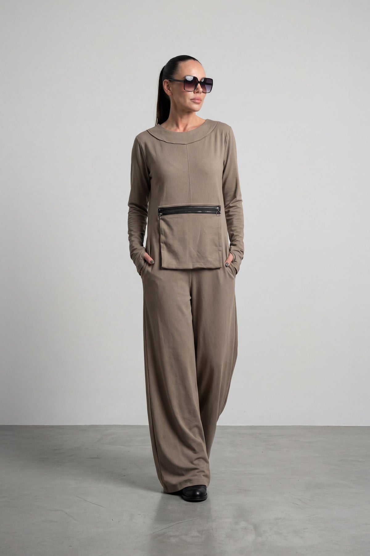 Woman wearing a brown outfit with sunglasses on a plain background EugFashion