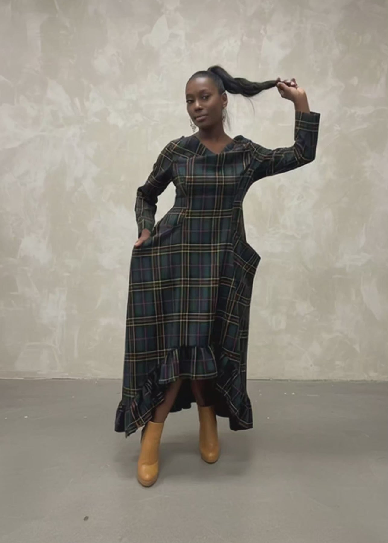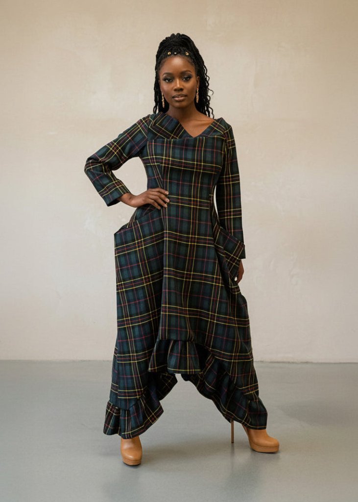 Stay stylish and cozy this winter with our dense cotton plaid dress, designed with a flattering French neckline and a unique asymmetrical cut. The ruffled hem adds movement and elegance, while the relaxed fit ensures comfort without losing femininity.
