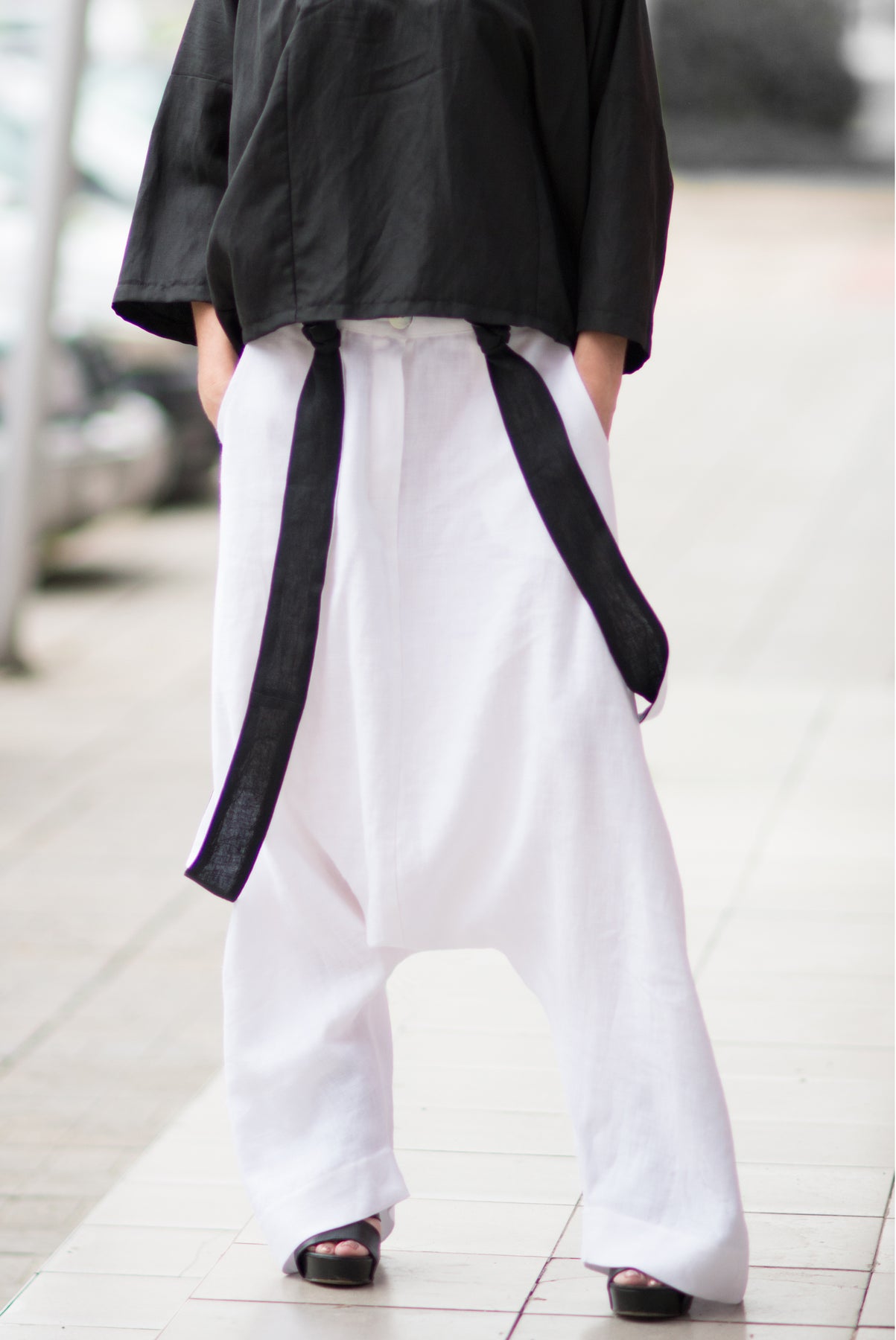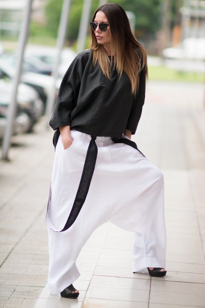 • Chic Suspender Accents: Featuring contrasting black and white suspenders, they add a bold and stylish edge to the classic harem silhouette.