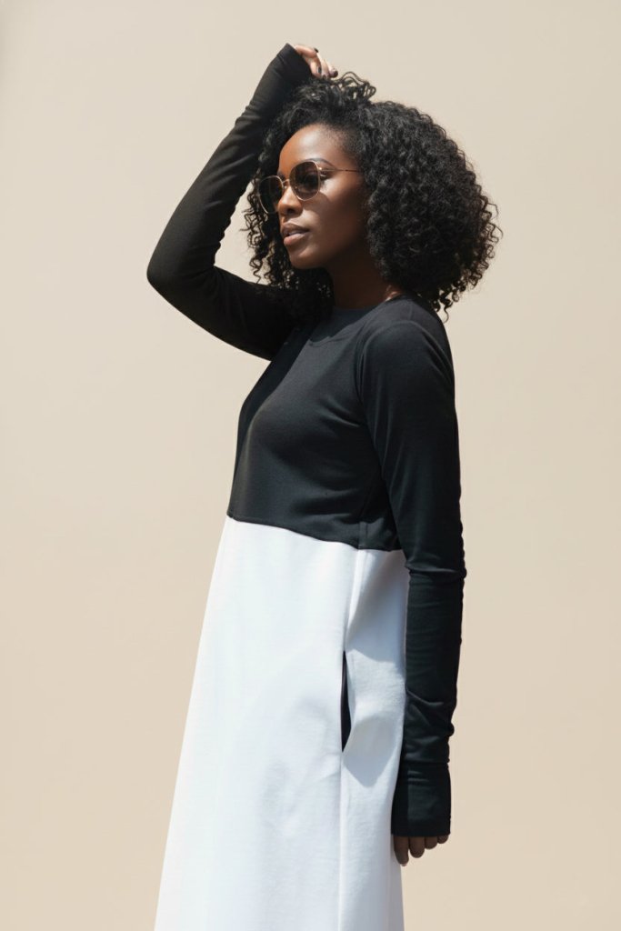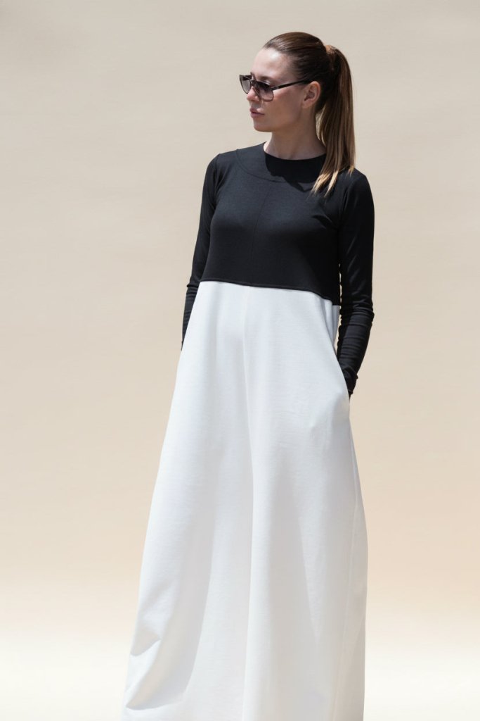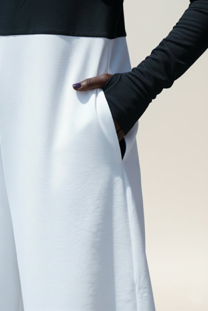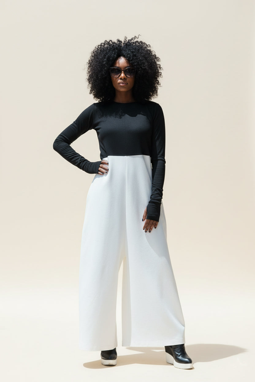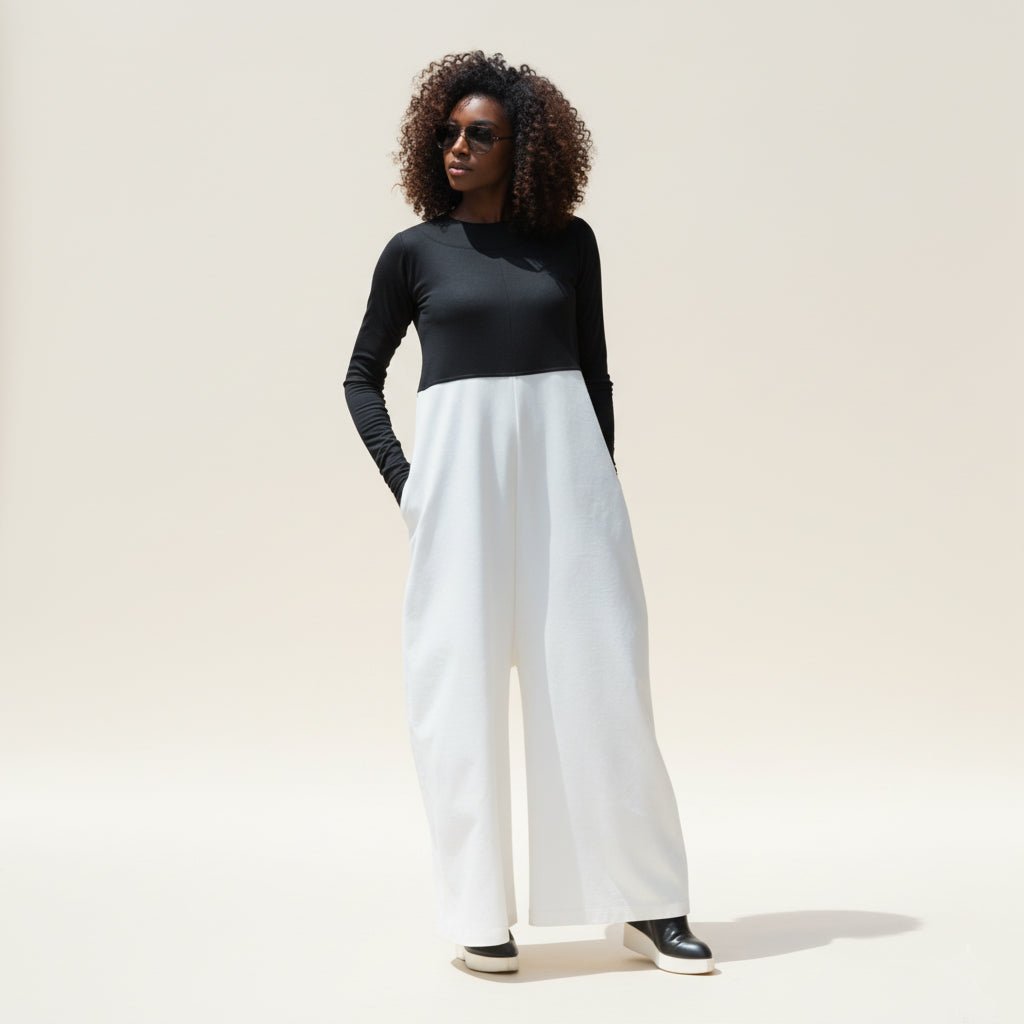 Effortless and modern—this black and white women’s jumpsuit delivers a sleek look with all-day comfort. Cut from breathable stretch cotton, it features short sleeves, a secure back zipper, and two functional side pockets. The relaxed silhouette moves with you, making it easy to dress up for work or down for casual weekends.