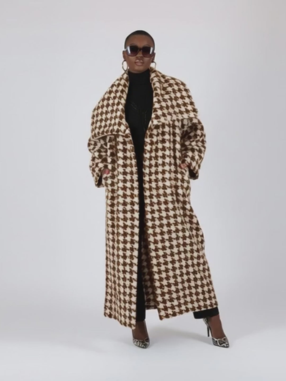 Stay warm and stylish with our Wool Winter Houndstooth Coat, a chic cape-style cardigan in a timeless ecru and brown houndstooth pattern. This versatile winter coat is perfect for layering over your everyday outfits or evening looks.
