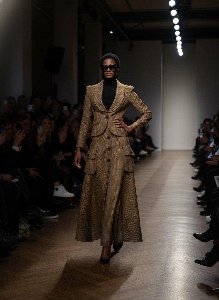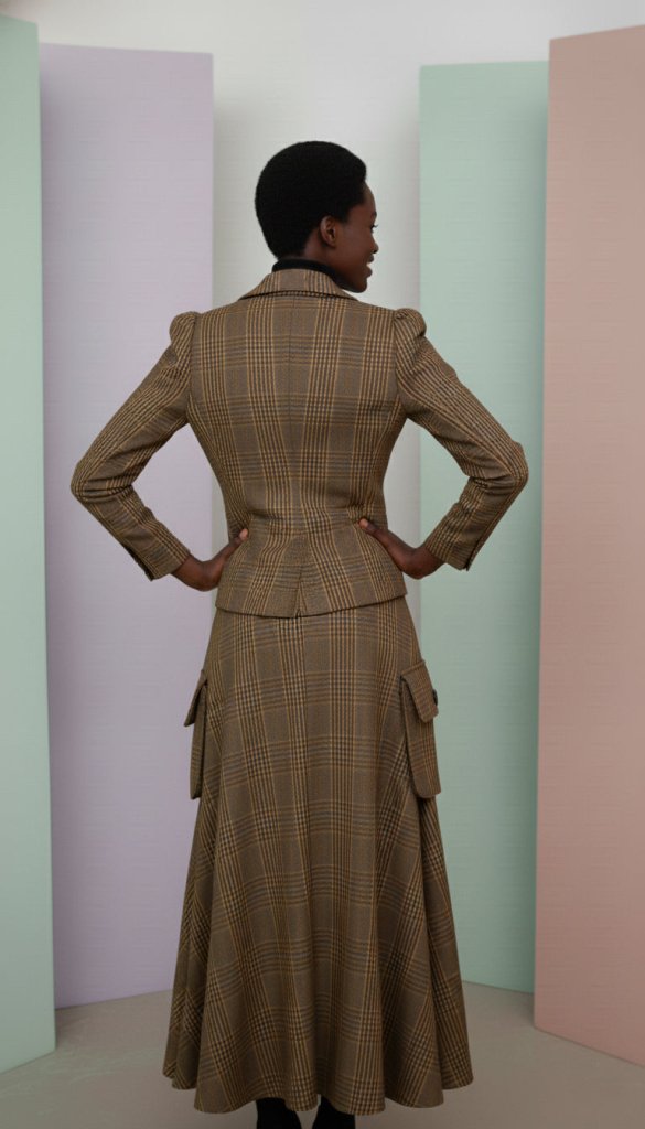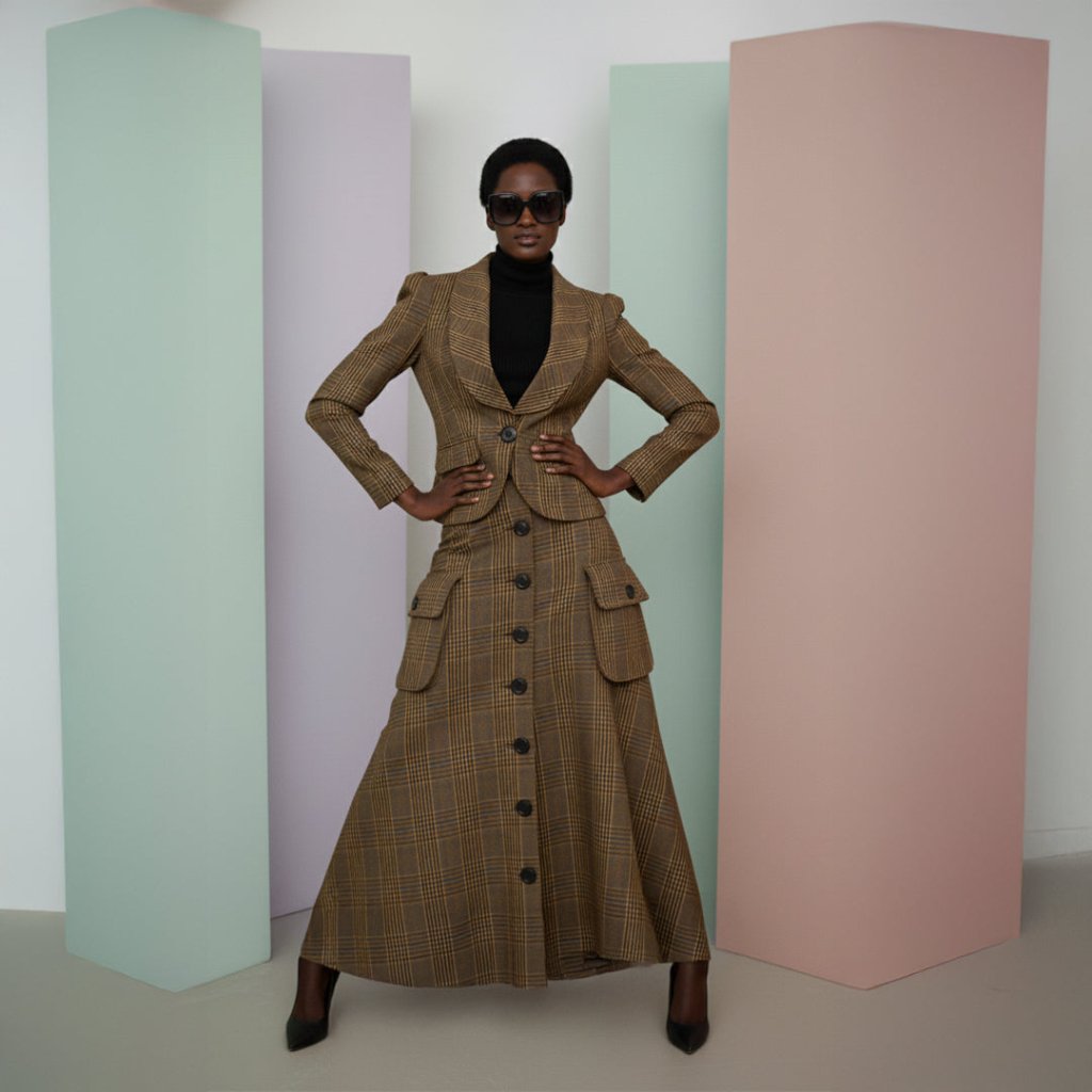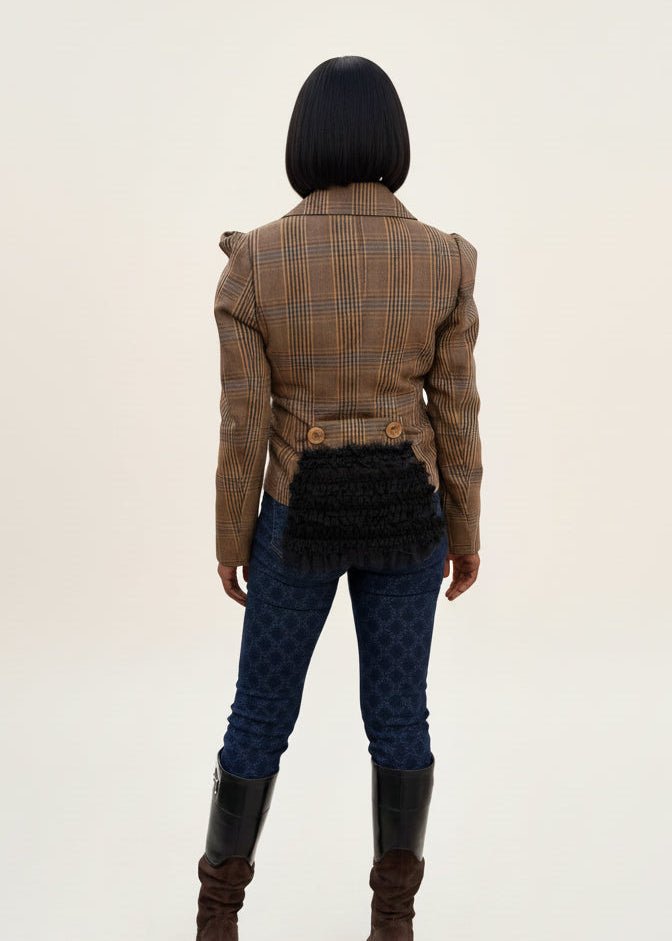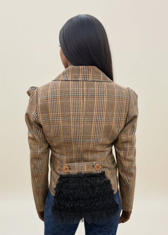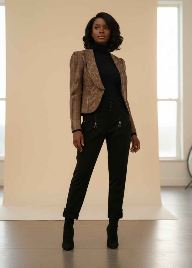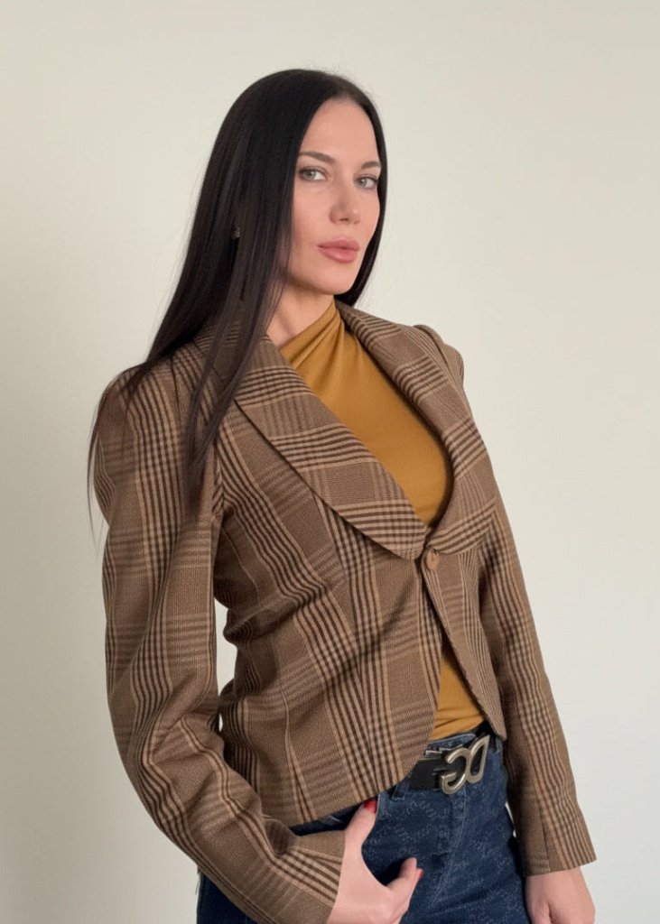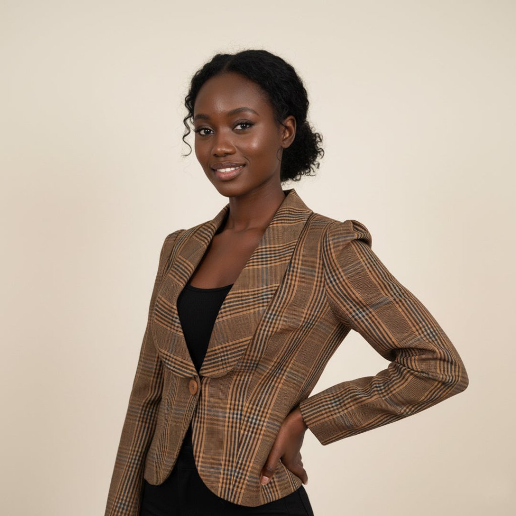 A modern take on the classic plaid blazer. This tailored, waist-defining jacket features a warm caramel and brown check pattern that instantly elevates any outfit. The softly shaped lapels, slightly structured shoulders and single button closure create a clean, feminine silhouette that works perfectly for the office, business meetings or smart-casual evenings.